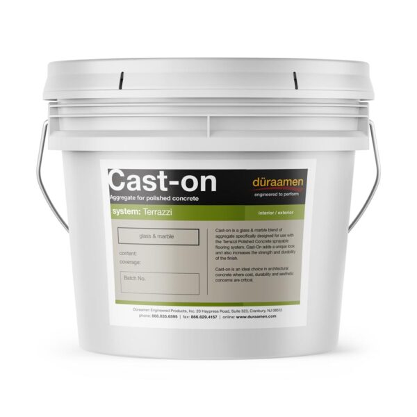 Cast On is a blend of finely graded aggregates and natural minerals used as a part of the Terrazzi sprayable polished concrete system. It is broadcasted on sprayed Arapido when it is still wet. Cast-On creates a marbleized polished concrete with a creamy salt-pepper concrete look. Cast-on can be blended with various Colorfast colors add natural concrete shades to the flooring surface. This creates unlimited coloring possibilities. Cast-on also imparts abrasion resistance to the flooring surface.
