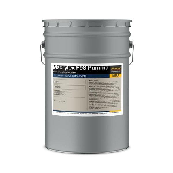 Macrylex F98 PUMMA is a high viscosity, 100% reactive, flexible methyl methacrylate polyurethane hybrid resin used as a crack isolation or waterproofing membrane under various Macrylex Systems or as resilient mortar or joint filler for numerous applications. Macrylex F98 PUMMA resists cracking caused by horizontal substrate movement, providing a crack resistant, resilient surface with superior performance in cold temperature environments. Macrylex F98 PUMMA offers stress-relieving properties for floor slabs showing movement and/or vibration. Excellent for use an intermediate membrane layer or patching mortar in loading docks and ramps, equipment rooms, large animal rooms, activity rooms, automotive and tooling industry, freezers, coolers, bridge decks, roof decks, pedestrian walkways, parking garages, ship decks, pool lines, pool decks, joint repair, food industry, dairies, beverage industry, and numerous other industries and applications.